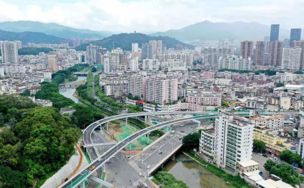 羅橋節(jié)點(diǎn)改造提升工程2019年11月開工建設(shè),2021年8月建成通車。該項(xiàng)目沿北環(huán)西路、龍興路設(shè)置南北分離式雙向四車道高架,南側(cè)接龍興路,北側(cè)接現(xiàn)狀北環(huán)西路,高架靠東側(cè)布置(緊貼烈士陵園),橋梁總長約1140米,凈寬約7.7米;在雙洋路、龍川北路、北環(huán)西路設(shè)置人行天橋,與山體步道銜接,以完善慢行系統(tǒng);在烈士陵園山體下采用明挖回填方式設(shè)置框涵,長度約225米,凈寬10.75米。工程投資1.4億元。